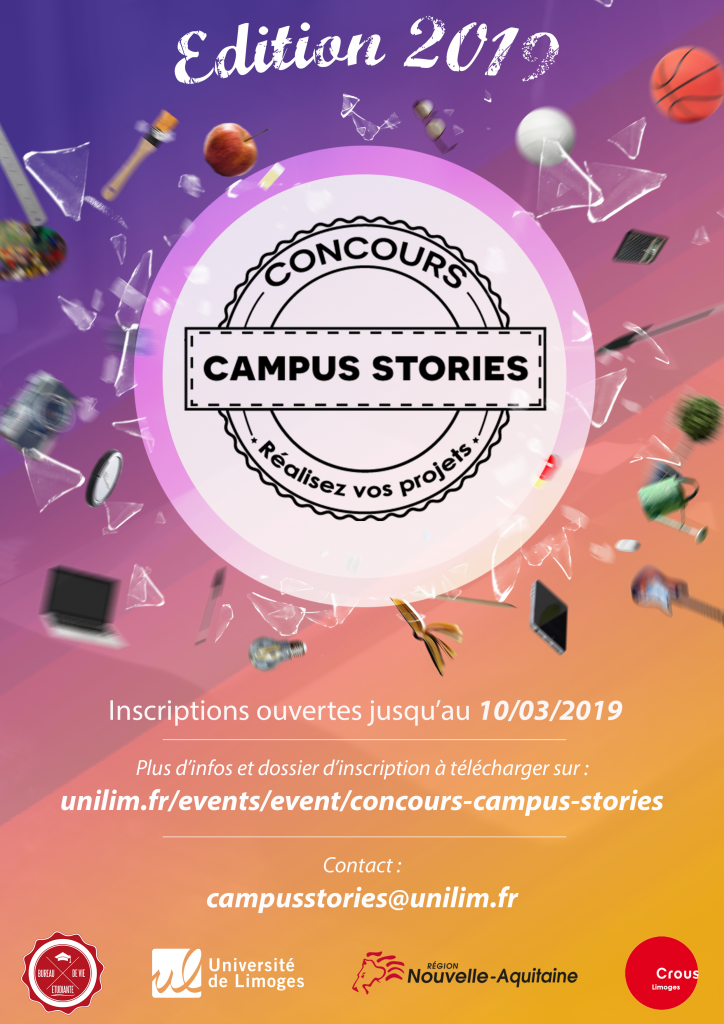 Ce concours organisé par l’Université de Limoges, le CROUS, et la Région Nouvelle-Aquitaine, a pour objet de faire participer activement des étudiants de l’Université au montage de projets. Il prime et récompense les projets étudiants les plus intéressants ou innovants dans les domaines :