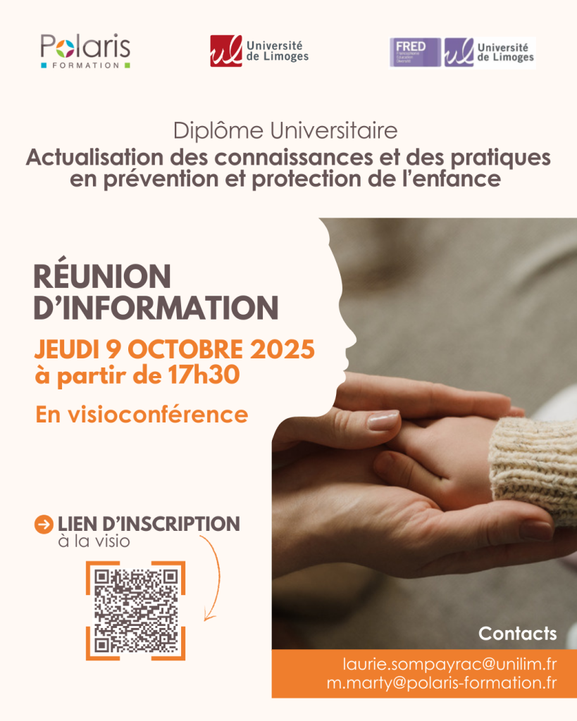 Face aux défis croissants de la protection de l’enfance, notamment l’augmentation du nombre d’enfants confiés à l’Aide Sociale à l’Enfance (ASE) et les réformes majeures impactant le secteur, la Faculté des Lettres et Sciences Humaines de l’Université de Limoges et Polaris Formation lancent un Diplôme Universitaire inédit « Actualisation des connaissances et des pratiques en prévention et protection de l’enfance ». Le secteur de la protection de l’enfance connaît des évolutions constantes qui nécessitent des échanges et des formations adaptées. Cette formation innovante, unique dans le nord de la Nouvelle-Aquitaine, vise à offrir aux professionnels des outils et des connaissances actualisées pour mieux appréhender les enjeux liés à la prévention et à la protection de l’enfance.