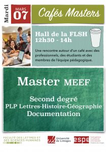 La Faculté des Lettres et des Sciences Humaines et l’ École Supérieure du Professorat et de l’Éducation propose un nouveau « Café Master » mardi 7 mars 2017 de 12h30 à 14h autour des Masters Métiers de l’Enseignement, de l’Éducation et de la Formation (MEEF) : 2nd degré, documentation et PLP Lettres-Histoire-Géographie.