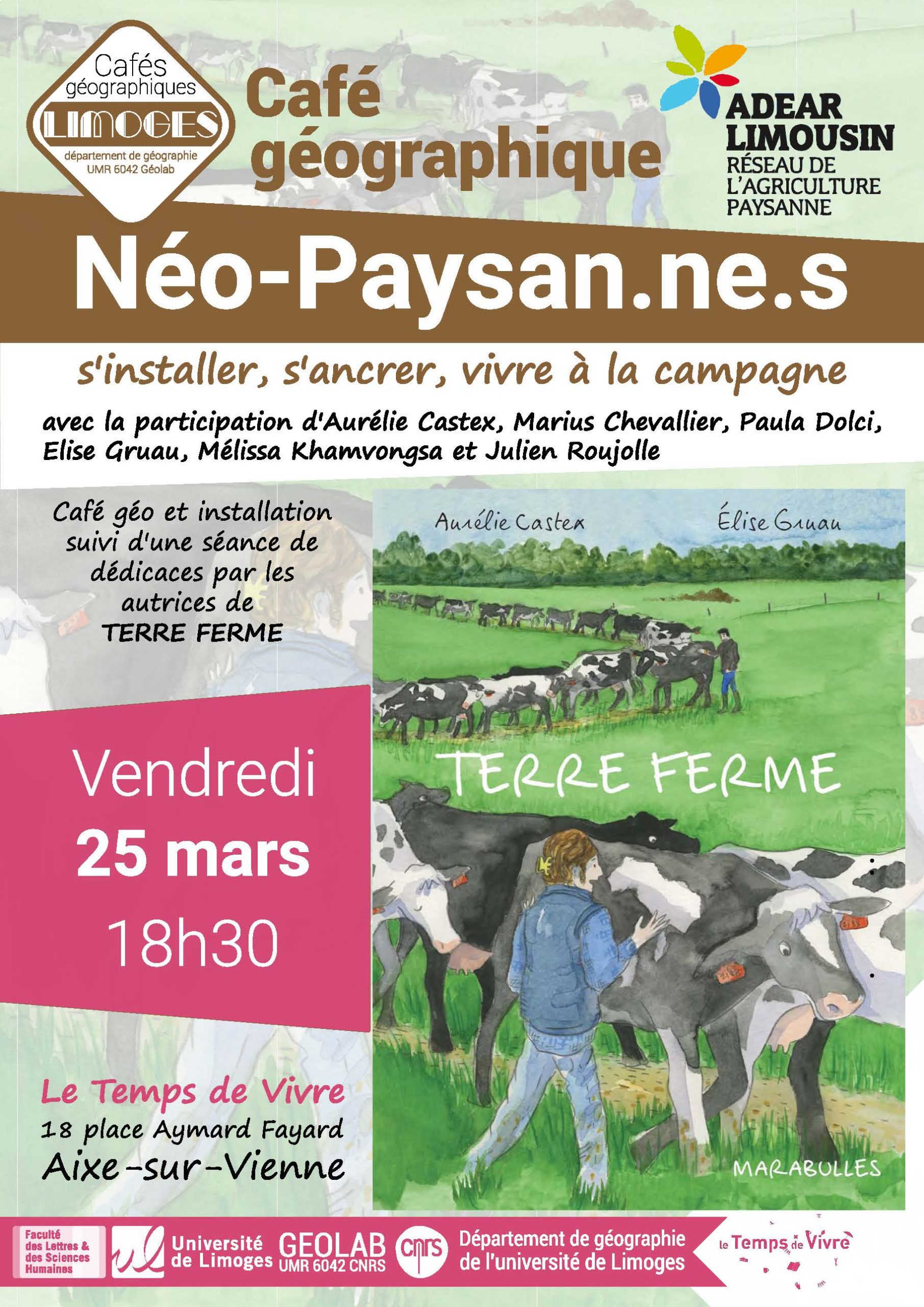 Retourner à la terre, retrouver du sens, cultiver un territoire : projet professionnel en même temps que projet de vie ancré sur un territoire, l’agriculture paysanne est un modèle agricole qui anime de plus en plus de candidat.e.s à l’installation, motivé.e.s par la recherche d’autonomie, par une production alimentaire locale, saine et accessible à tout.e.s et par une participation aux dynamiques des territoires. Mais qui sont les néo-paysann.e.s, quelles sont leurs trajectoires? Comment accompagner des projets d’installation alternatifs ? Comment l’agriculture paysanne peut-elle permettre la transition écologique et alimentaire au sein des territoires ? Ce café géographique croise les regards de chercheur.e.s, d’auteur.e.s, d’acteur.trice.s de terrain pour répondre à ces questionnements, entre parcours individuels des néo-paysan.ne.s et enjeux territoriaux : Paula Dolci (géographe), Melissa Khamvongsa et Julien Roujolle (ADEAR), Marius Chevallier (GEOLAB, Terre de Liens), Elise Gruau et Aurélie Castex (auteures de la BD Terre Ferme) partageront ainsi leurs expériences.