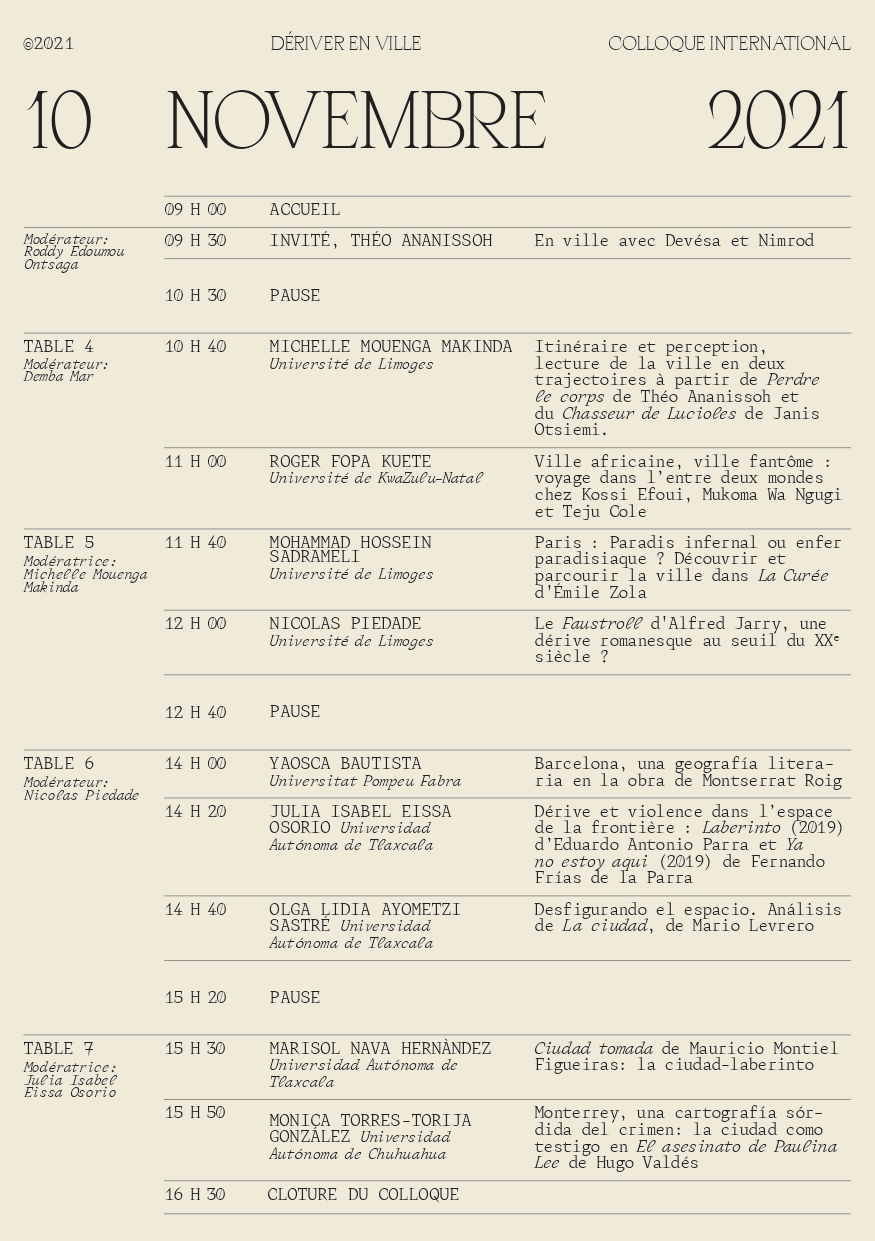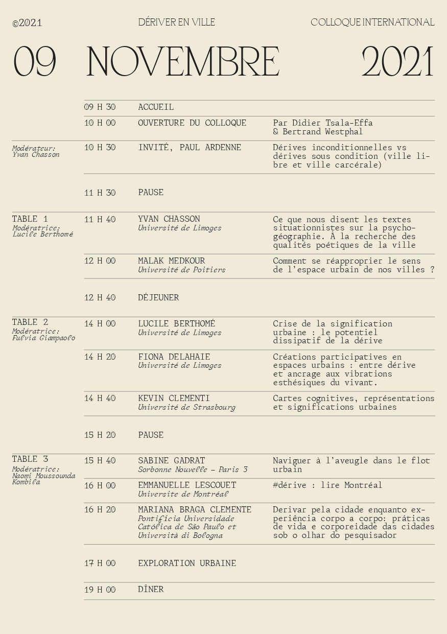 Les membres du comité d’organisation du colloque « Dériver en ville » sont très heureux de vous présenter le programme de ces deux journées qui se dérouleront les 09 et 10 novembre 2021 à la FLSH, Salle des Actes.