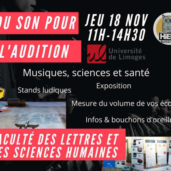 Un jeu de stands regroupant le SoundPark, l‘exposition Phonographe.mp3, la borne d‘arcade Loga–Rythmes, des supports de prévention, un dispositif permettant de mesurer le volume d‘écoute au casque des appareils des étudiants et des test de dépistage réalisés par le Service de Santé Universitaire. - à 17h30 en amphi Vareille