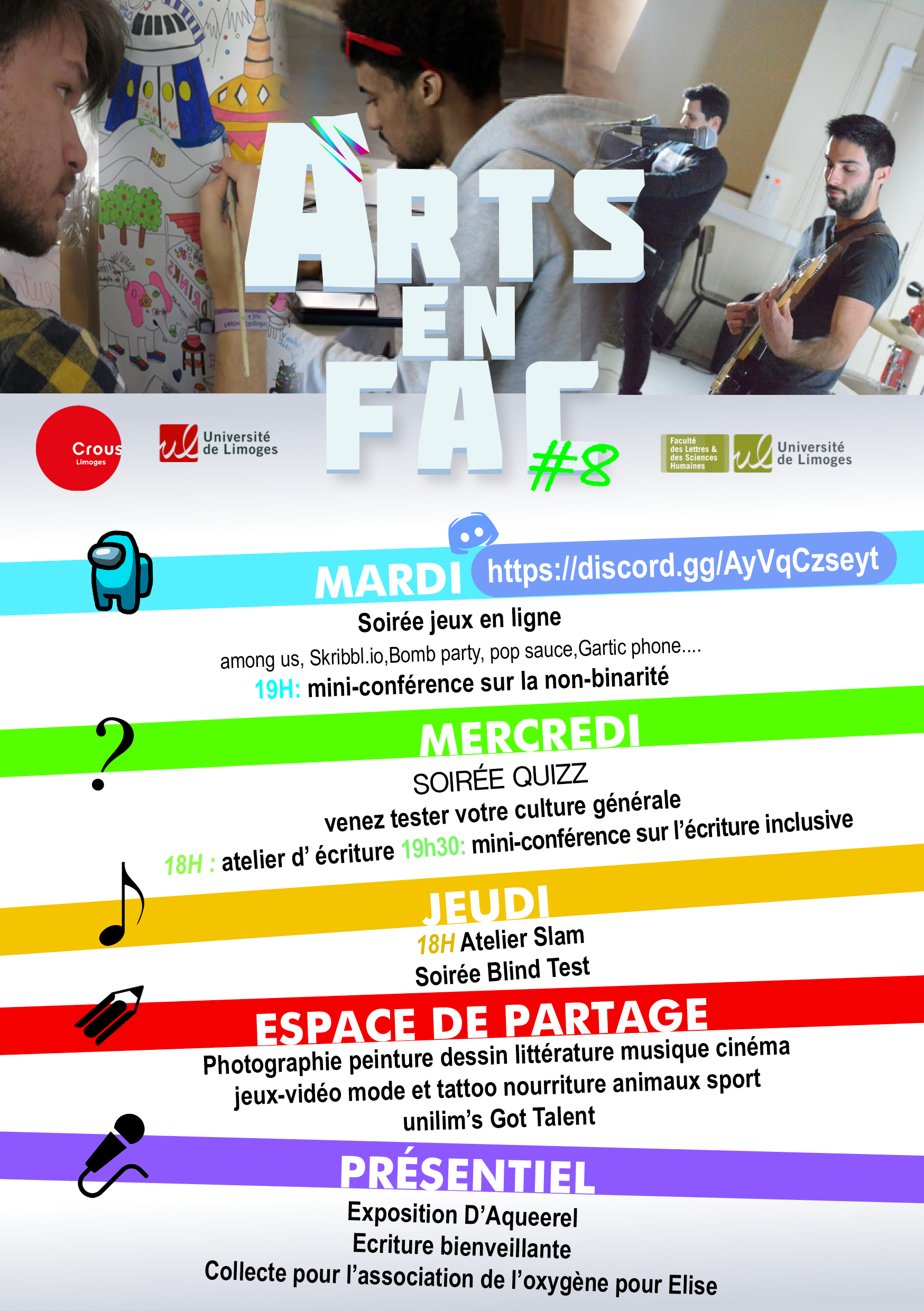 Catégories : Arts en fac 8 Arts en fac 8 39e rue Camille Guérin 87036 Limoges - France Tél. (+33) 05 55 43 56 00 Université ouverte source de réussites