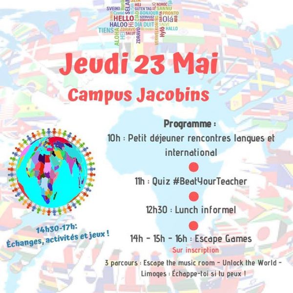 • 10h : rencontres et échanges autour des langues et de la mobilité internationale avec un petit déjeuner offert