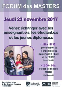 Catégories : SALON Master 2017 FLSH SALON Master 2017 FLSH 39e rue Camille Guérin 87036 Limoges - France Tél. (+33) 05 55 43 56 00 Université ouverte source de réussites