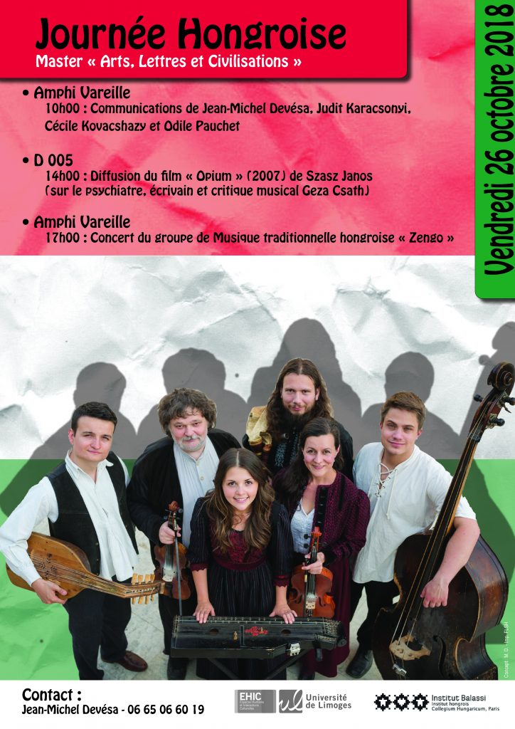- De 10h00 à 12h00, Amphithéâtre Vareille : Communications de Jean-Michel Devésa (Université de Limoges) : le travail du peintre contemporain Csaki Robert ; Judit Karacsonyi (Université de Szeged) : (sur les grands succès récents de la création artistique hongroise : « Être sans destin » d’Imre Kertész, son adaptation cinématographique par Lajos Koltai, et « Fils » de Saul de Làszló Nemes) ; Cécile Kovacshazy (Université de Limoges) : Sandor Ferenczi et les écrivains hongrois ; Odile Pauchet (Université de Limoges) : La Traduction des « Lumières » par les universitaires de Szeged dirigé(e)s par Olga Penke.