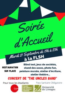 Catégories : Soirée d’accueil Soirée d’accueil 39e rue Camille Guérin 87036 Limoges - France Tél. (+33) 05 55 43 56 00 Université ouverte source de réussites