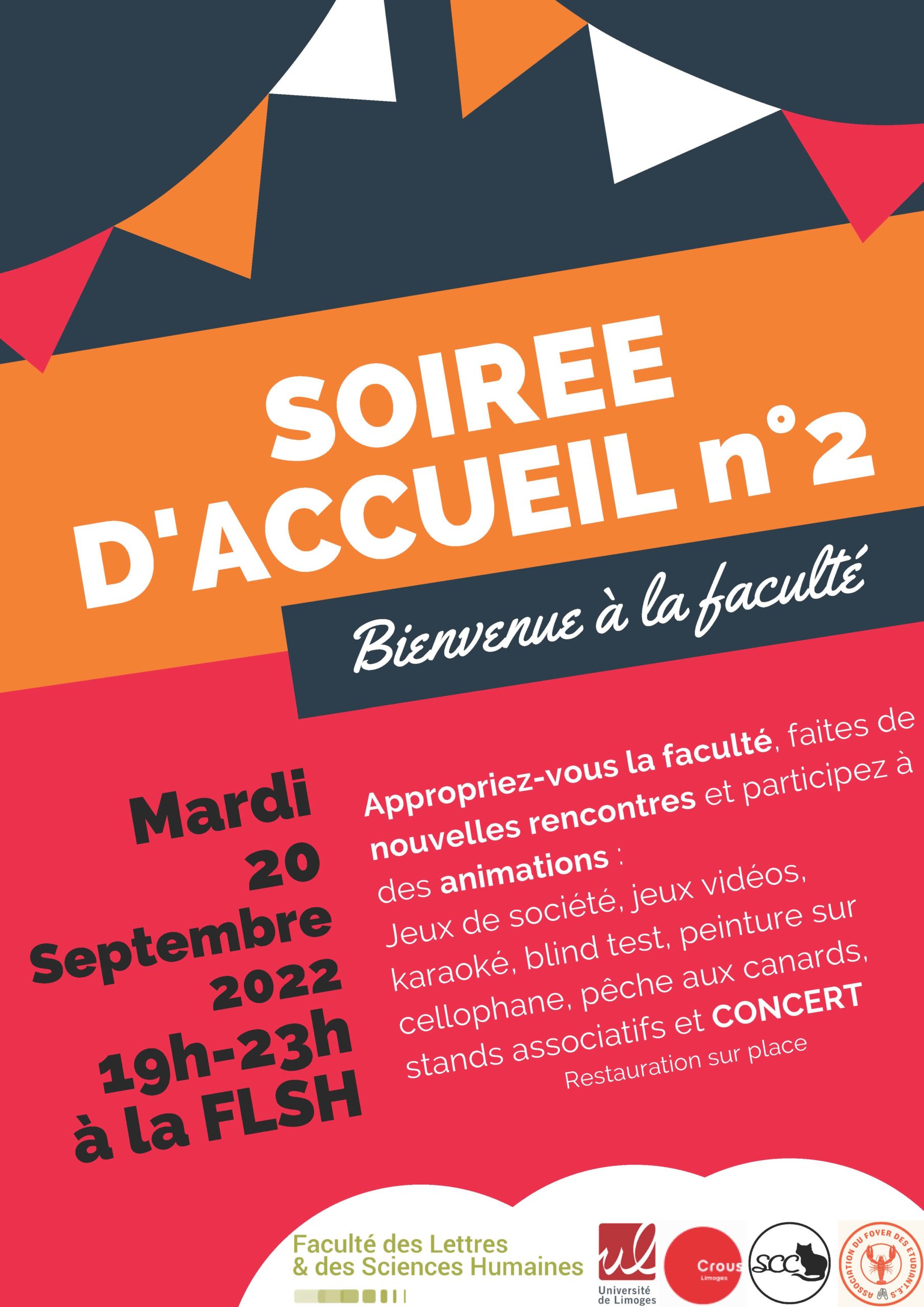 Catégories : Animation du campus / Evénement Soirée d’accueil à la FLSH ! Détails Début: 20 septembre 2022, 19 h 00 min Catégories: Animation du campus, Evénement Présentation La Faculté propose une soirée d’accueil aux étudiants et étudiantes pour fêter la rentrée universitaire ! Rendez-vous mardi 20 septembre de 18h à 23h AU PROGRAMME : Blind test, karaoké stand des associations, jeux de société, théâtre, , concert… Contact : *protected email*