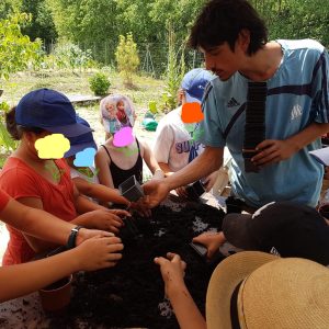 Nos apprenti.e.s en action : Laurine (à gauche), étudiante en apprentissage (2023_2024) à La Soret, à proximité de Tours, chez Claude Pasquer. Basile (à droite), étudiant en apprentissage (2024-2025) au Secours Populaire de Limoges. Tous deux participent pleinement à toutes les missions de conception-réalisation, animation d’un paysage nourricier